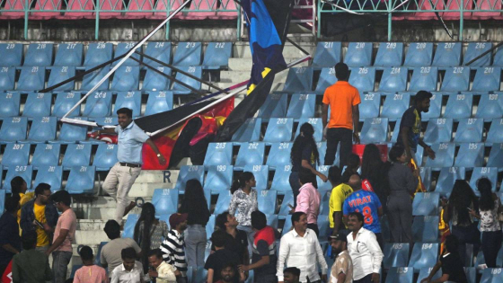 এবারের বিতর্ক আসে গতকালের অস্ট্রেলিয়া ও শ্রীলঙ্কা ম্যাচের ভেন্যু লখনৌর একানা স্টেডিয়াম থেকে। শ্রীলঙ্কা এবং অস্ট্রেলিয়ার মধ্যকার সোমবারের ম্যাচে হানা দেয় বৃষ্টি। এর আগে পর্যন্ত ম্যাচ চলছিল ভালোই। তবে দমকা বাতাসসহ বৃষ্টি আবহ বদলে দেয় ম্যাচের। বাতাসের কারণে ভেঙে যায় গ্যালারির হোর্ডিং। এতে অনেক বড় বিপদ হতে পারত। তবে ভারত বিশ্বকাপের আরেকটি সমালোচনার জায়গা খালি গ্যালারি আশীর্বাদই হয়ে দেখা দেয়। না হলে বড় রকমের দুর্ঘটনা দেখত ক্রিকেট দুনিয়া।