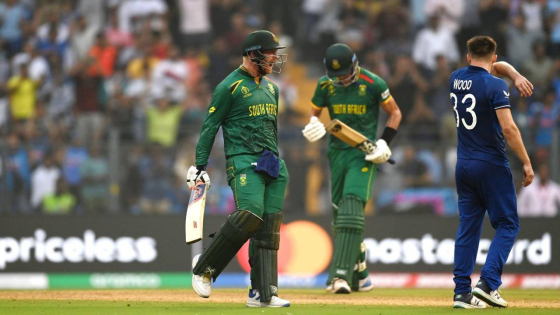 মুম্বাইয়ে প্রথমে ফিল্ডিংয়ের সিদ্ধান্ত নেন ইংলিশ অধিনায়ক জস বাটলার। দ্বিতীয় বলেই ইনফর্ম কুইন্টন ডি কককে হারিয়ে দুর্দান্ত শুরু করে ইংল্যান্ড। দ্বিতীয় জুটিতে ১২১ রান যোগ করেন রাসি ফন ডার ডুসেন ও রেজা হেনড্রিকস। ২০তম ওভারে ইংলিশদের খেলায় ফিরিয়েছিলেন লেগস্পিনার আদিল রশিদ। ডুসেনকে ৬০ রানে সাজঘরে ফেরত পাঠান এই ইংলিশ স্পিনার। অধিনায়ক টেম্বা বাভুমার অসুস্থতার কারণে ওপেনিংয়ে নামা রেজা ৭৫ বলে ৮৫ রানে আউট হন।