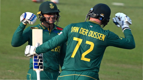 পুনেতে টস জিতে দক্ষিণ আফ্রিকাকে প্রথমে ব্যাটিংয়ে পাঠান কিউই অধিনায়ক টম লাথাম। উদ্বোধনী জুটিতে ৩৮ রান সংগ্রহ করে প্রোটিয়ারা। ২৪ রানে সাজঘরে ফিরে যান অধিনায়ক টেম্বা বাভুমা। দ্বিতীয় উইকেটে ডুসেনকে নিয়ে ২০০ রানের বিশাল জুটি গড়েন আরেক ওপেনার কুইন্টন ডি কক। ২৩৮ রানের মাথায় ১১৪ রানে আউট হন প্রোটিয়া উইকেটকিপার। এটা নিয়ে এবারের প্রতিযোগিতায় চতুর্থ সেঞ্চুরি হাঁকালেন ডি কক। ১১৬ বলে ১০টি চার ও ৩টি ছক্কা মারেন প্রোটিয়া তারকা।