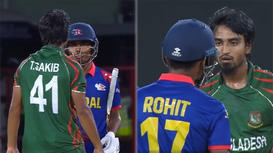 নেপালের বিপক্ষে ব্যাটারদের ব্যর্থতায় মাত্র ১০৬ রানে গুটিয়ে যায় বাংলাদেশের ইনিংস। সে ম্যাচের শুরু থেকে আগ্রাসী মনোভাবে বোলিং করছিলেন তানজিম। দ্বিতীয় ওভারে সাজঘরে ফেরান নেপালের দুই ব্যাটারকে। নিজের পরের ওভারে আগ্রাসী বোলিংয়ের পর নেপালের অধিনায়ক রোহিতের দিকে তেড়ে যান তানজিম। বাগবিতন্ডায় জড়ান দুজন। সেই ভিডিও ভাইরাল হয় সামাজিক যোগাযোগমাধ্যমে। সাকিবের আচরণ পছন্দ হয়নি মাঠের দুই আম্পায়ারের। তাদের রিপোর্টের ভিত্তিতে সাকিবের বিরুদ্ধে আইসিসির কোড অব কন্ডাক্ট (আচরণ বিধি) ভঙ্গের অভিযোগ আনা হয়।