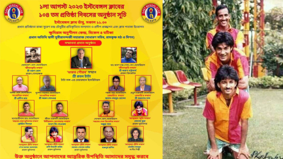 আগামী ১ আগস্ট কলকাতার ঐতিহ্যবাহী ফুটবল ক্লাব ইস্ট বেঙ্গলের ১০৪তম প্রতিষ্ঠাবার্ষিকী। ক্লাবটি তাদের বিশেষ দিনে স্মরণ করেছে তাদের কিংবদন্তি ফুটবলারদের। সেই সঙ্গে বাংলাদেশের ৪ সাবেক ফুটবলার ও একজন সংগঠককে সম্মাননা জানাবে ভারতীয় ক্লাবটি।