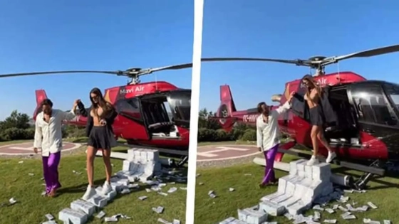 ভিডিওতে দেখা যায়, রুশ ওই ইনফ্লুয়েন্সারের প্রেমিকা হেলিকপ্টার থেকে নামেন। এরপর তার হাত ধরে তিনি নগদ টাকার স্তূপের তৈরি কার্পেটের ওপর দিয়ে হেঁটে যান। ভিডিওর ক্যাপশনে ভালোবাসার ইমোজি দেওয়া হয়েছে।