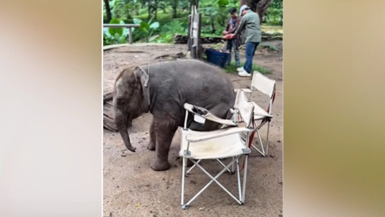 পরের দৃশ্যে দেখা যায়, শাবকটি মাটিতে পড়ে থাকা ভাঁজ করা চেয়ারটিকে শুঁড় দিয়ে নেড়েচেড়ে দেখছে, যেন সেটি খুলতে চাইছে এবং আরও একবার চেষ্টা করার জন্য প্রস্তুত হচ্ছে। ভিডিওটির ক্যাপশন লেখা ছিল থাই ভাষায়। যার মর্মার্থ ‘চেয়ারে একটু শান্তভাবে বসতে চেয়েছিলাম, কিন্তু চেয়ার বোঝে না।’
