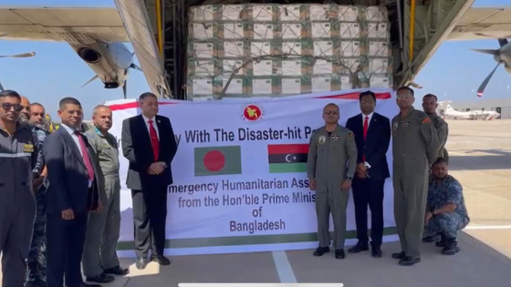 ঘূর্ণিঝড় ড্যানিয়েল ও বন্যার তাণ্ডবে লিবিয়ার পূর্বাঞ্চল বিশেষত দারনা, সাহাত, আল-বাইদা ও আল-মার্জসহ ক্ষতিগ্রস্ত অঞ্চলের মানুষের জন্য ওষুধ ও শুকনো খাবারসহ ত্রাণসামগ্রী পাঠিয়েছে বাংলাদেশ সরকার। প্রধানমন্ত্রীর নির্দেশে বাংলাদেশ সরকারের পক্ষ থেকে দ্রুততম সময়ের মধ্যে জরুরি মানবিক সহায়তার পদক্ষেপ নেওয়া হয়। এ প্রেক্ষিতে শুক্রবার (১৫ সেপ্টেম্বর) পররাষ্ট্র মন্ত্রণালয়, দুর্যোগ ব্যবস্থাপনা ও ত্রাণ মন্ত্রণালয় এবং আর্মড ফোর্সেস ডিভিশনের ব্যবস্থাপনায় প্রয়োজনীয় লজিস্টিক সাপোর্ট, জরুরি ওষুধপত্র এবং ত্রাণসামগ্রী নিয়ে বাংলাদেশের সি-১৩০ এয়ারক্রাফট বেনগাজীর বেনিনা আন্তর্জাতিক বিমানবন্দরে অবতারণ করে। এ সময় লিবিয়ায় নিযুক্ত বাংলাদেশের রাষ্ট্রদূত মেজর জেনারেল আবুল হাসনাত মুহাম্মদ খায়রুল বাশার বাংলাদেশ বিমান বাহিনীর প্রতিনিধি দলকে স্বাগত জানান।