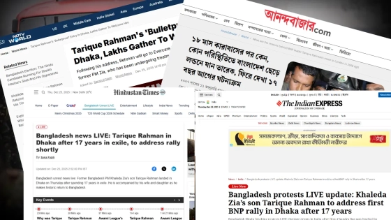 দ্য ইন্ডিয়ান এক্সপ্রেসের শিরোনামে বলা হয়েছে, ১৭ বছর পর ঢাকায় বিএনপির প্রথম সমাবেশে ভাষণ দেবেন খালেদা জিয়ার ছেলে তারেক রহমান। টাইমস নাওয়ের এক শিরোনামে বলা হয়েছে, ড. মুহাম্মদ ইউনূসের সঙ্গে কথা বলেছেন তারেক রহমান, ভাষণ দেবেন মেগা সমাবেশে।