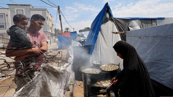 সব ধ্বংস, কষ্ট, বেদনাকে পাশ কাটিয়ে ঈদকে বরণও করে নিয়েছেন ফিলিস্তিনিরা। দক্ষিণ গাজা উপত্যকার রাফাহতে একটি তাঁবু শিবিরে ঈদুল ফিতর উপলক্ষে ঐতিহ্যবাহী কেক তৈরি করছে বাস্তুচ্যুত এক ফিলিস্তিনি পরিবার।