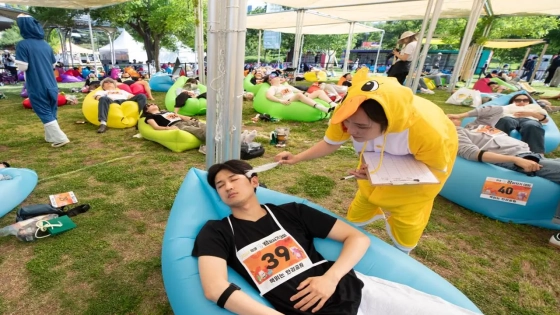 বিশ্বের সবচেয়ে কম ঘুমানো জাতির মধ্যে অন্যতম হলো দক্ষিণ কোরিয়ানরা। কর্মব্যস্ত এ জাতির যেন দম ফেলার সুযোগ নেই। ফলে অভ্যাসও নেই তেমন একটা বিশ্রাম নেওয়ার। তাই এ এ জাতির লোকদের নিয়ে শনিবার (১৮ মে) সিউলের হ্যান রিভার পার্কে ন্যাপ কনটেস্ট বা ঘুমের প্রতিযোগিতা হয়।