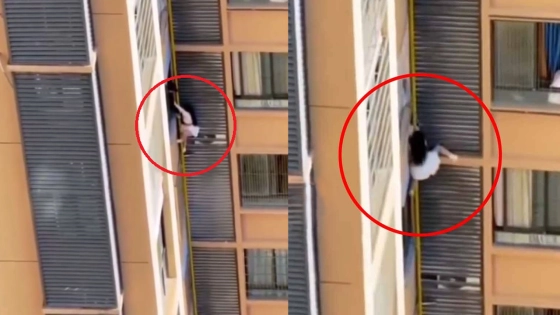 সেই ভিডিওতে দেখা গেছে, তরুণী উঁচু বহুতল ভবনের জানালা দিয়ে বাইরে বেরিয়ে আসছেন, এসময় তার পরনে সাদা রঙের পোশাক। জানালা থেকে এক লাফ দিয়ে পাইপ বেয়ে ভবনের নিচে নামতে শুরু করেন তিনি। পরে পা পিছলে পড়ে যাওয়ার ভয়ে একই ভাবনের অন্য এক ফ্ল্যাটের জানালায় ধাক্কা দেয় সে। ওই ফ্ল্যাটের বাসিন্দা হাত ধরে টেনে তরুণীকে উপরে তুলে আনেন।