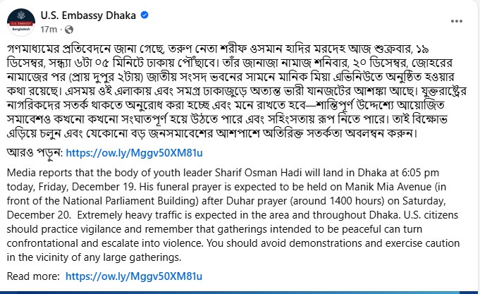 দূতাবাসের জারি করা সতর্কবার্তায় লেখা হয়- ‘গণমাধ্যমের প্রতিবেদনে জানা গেছে, তরুণ নেতা শরীফ ওসমান হাদির মরদেহ আজ শুক্রবার, ১৯ ডিসেম্বর, সন্ধ্যা ৬টা ০৫ মিনিটে ঢাকায় পৌঁছাবে। তাঁর জানাজা নামাজ শনিবার, ২০ ডিসেম্বর, জোহরের নামাজের পর (প্রায় দুপুর ২টায়) জাতীয় সংসদ ভবনের সামনে মানিক মিয়া এভিনিউতে অনুষ্ঠিত হওয়ার কথা রয়েছে। এসময় ওই এলাকায় এবং সমগ্র ঢাকাজুড়ে অত্যন্ত ভারী যানজটের আশঙ্কা আছে। যুক্তরাষ্ট্রের নাগরিকদের সতর্ক থাকতে অনুরোধ করা হচ্ছে এবং মনে রাখতে হবে—শান্তিপূর্ণ উদ্দেশ্যে আয়োজিত সমাবেশও কখনো কখনো সংঘাতপূর্ণ হয়ে উঠতে পারে এবং সহিংসতায় রূপ নিতে পারে। তাই বিক্ষোভ এড়িয়ে চলুন এবং যেকোনো বড় জনসমাবেশের আশপাশে অতিরিক্ত সতর্কতা অবলম্বন করুন।’