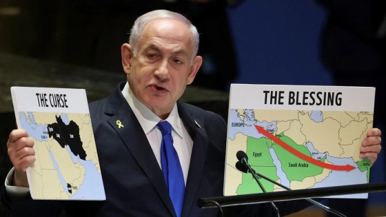 নেতানিয়াহুর ভাষায় তার হাতে থাকা মানচিত্রের একটি বিশ্বের জন্য শান্তির আশীর্বাদ এবং অপরটি অভিশাপ। অভিশাপের বিশ্বে সিরিয়া, ইরাক ও ইরানের মানচিত্র কালো রংয়ে ঢাকা। আর শান্তির মানচিত্রে এ তিন দেশ ও লেবাননের সার্বভৌমত্বের কোনো অস্তিত্ব নেই।