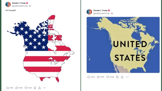 শেয়ার করা মানচিত্রগুলোতে যুক্তরাষ্ট্র এবং কানাডার সীমান্ত মুছে ফেলা হয়েছে এবং দুটি দেশকে একক রাষ্ট্র হিসেবে চিত্রিত করা হয়েছে। প্রথম মানচিত্রে ‘ইউনাইটেড স্টেটস’ শব্দটি নতুন সত্তার ওপর বসানো হয়, আর দ্বিতীয়টি কানাডা এবং যুক্তরাষ্ট্রের ভূখণ্ডকে যুক্তরাষ্ট্রের পতাকার রঙে রাঙানো হয়, সঙ্গে লেখা ছিল ‘ওহ কানাডা!’