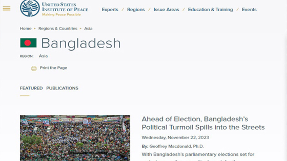 রাজধানী ঢাকায় বিএনপির ২৮ অক্টোবরের মহাসমাবেশ কেন্দ্র করে ঘটে যাওয়া নানা প্রসঙ্গ উঠে এসেছে যুক্তরাষ্ট্রের ফেডারেল থিংক ট্যাংক ইউনাইটেড স্টেটস ইনস্টিটিউট অব পিস (ইউএসআইপি)-এর একটি প্রতিবেদনে। যেখানে মহাসমাবেশ কেন্দ্র করে পরবর্তী সহিংসতা ও বিরোধী দলগুলোর ডাকা হরতাল-অবরোধে গাড়িতে অগ্নিসংযোগের প্রসঙ্গ উঠে আসে। গত ২২ নভেম্বর ইউএসআইপি প্রতিবেদনটি প্রকাশ করে।